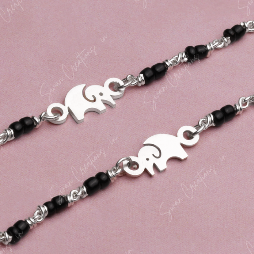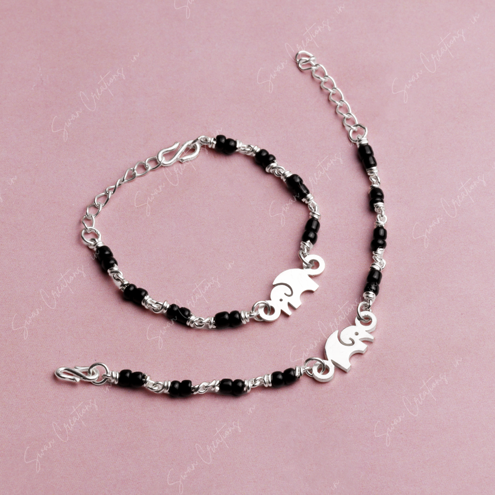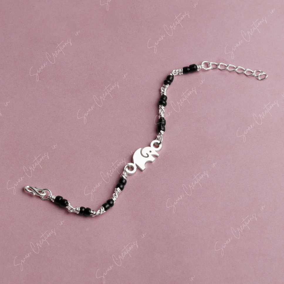 Elegant Nazariya bracelet featuring 925 silver and black bead chain with a charm, customizable sizes, and handmade with double beads for a unique look.